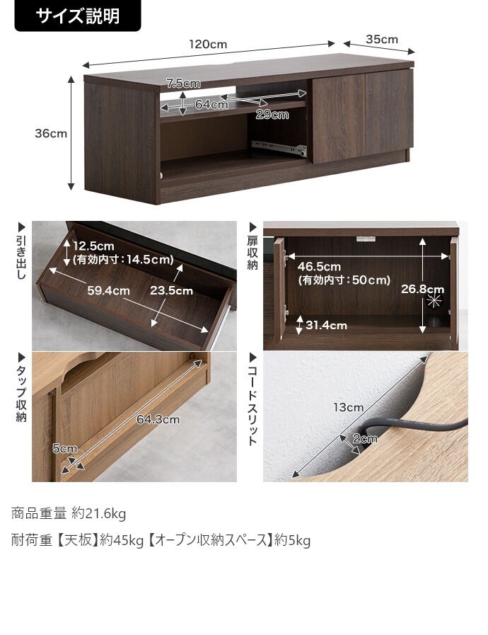 【耐荷重】天板:約45kg 、オープン収納スペース:約5kg、引き出し底板:約8kg