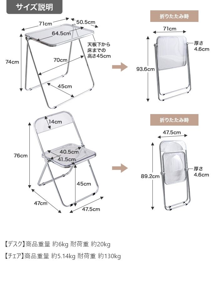 【耐荷重】デスク:約20kg、チェア:約130kg
