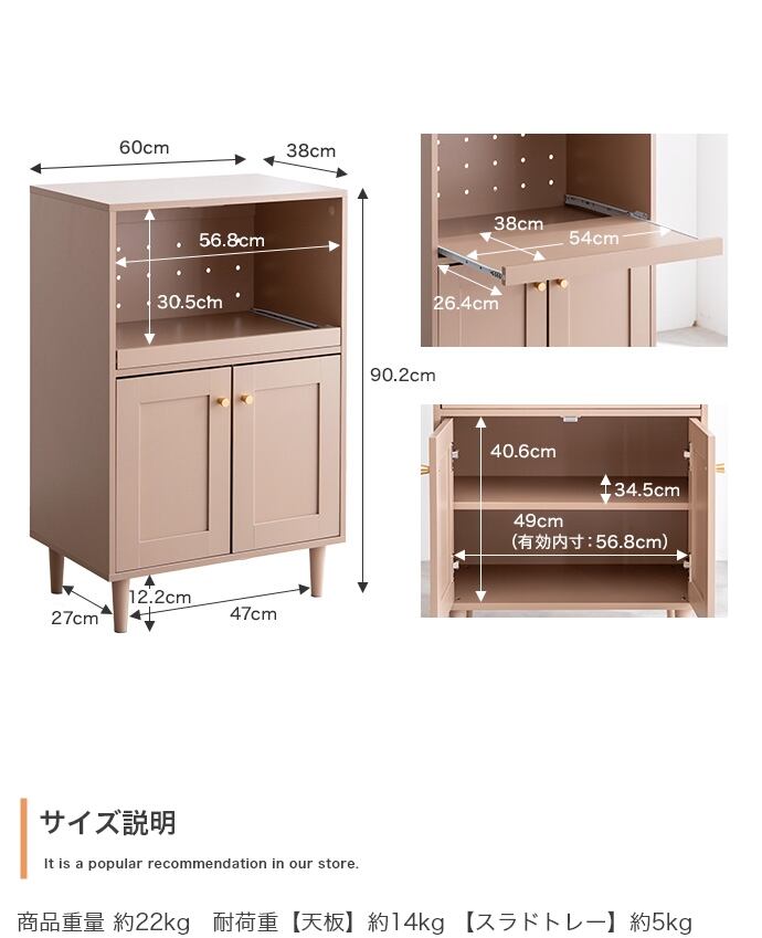 【耐荷重】天板:約14kg、スライドトレー:約5kg、可動棚:約4kg、底板:約4kg