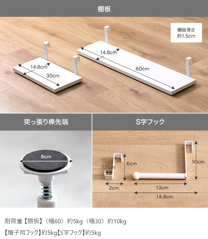 【耐荷重】棚板(幅60):約5kg 、棚板(幅30):約10kg 、帽子用フック:約5kg、S字フック:約5kg
